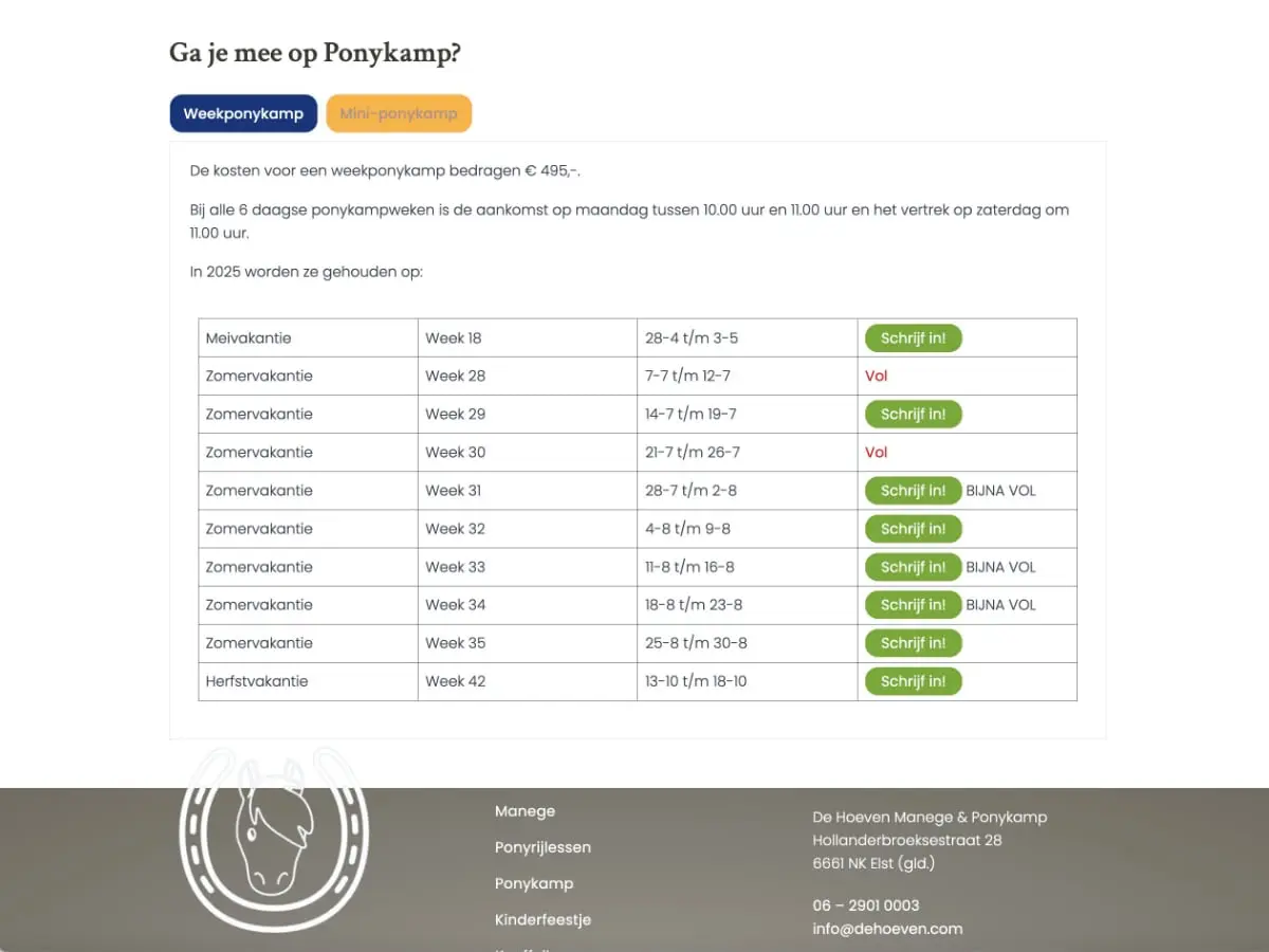 Niet alles hoeft technisch / ingewikkeld te zijn om goed te werken. Voor de ponykampen kozen we bewust voor een praktische oplossing: een overzichtelijke spreadsheet waarin de eigenaren zelf eenvoudig per kamp kunnen aangeven of er nog plekken beschikbaar zijn.